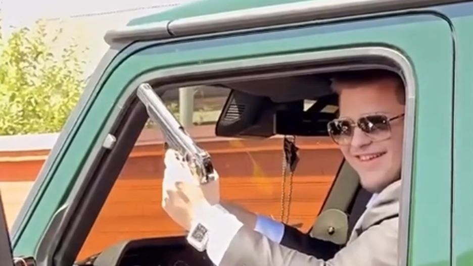 Na nagraniu udostępnionym w mediach społecznościowych Adam wystrzeliwuje w powietrze złoty pistolet, pozuje przed lustrem ze swoimi kumplami.