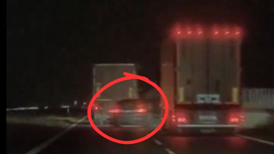 Na wideo zarejestrowanym na drodze ekspresowej, dwa pasy były zajęte przez jadące obok siebie samochody ciężarowe. Nagle na lewym pasie pojawiła się osobówka, której kierowca pędził z dużą prędkością.