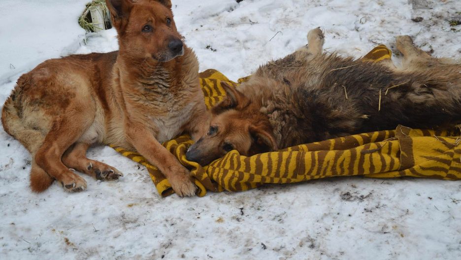 Szczenna suka w zabitej deskami budzie i sparaliżowane psy na mrozie