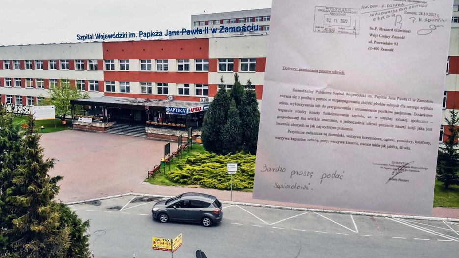 Skan pisma dyrektora Samodzielnego Publicznego Szpitala Wojewódzkiego im. Papieża Jana Pawła II w Zamościu do wójta gminy Zamość opublikowano m.in. na Facebooku, Instagramie czy Twitterze. W piśmie z 28 października dyrektor placówki prosi o pomoc w rozpropagowaniu zbiórki płodów rolnych "celem wykorzystania ich do przygotowania i urozmaicenia posiłków pacjentom".