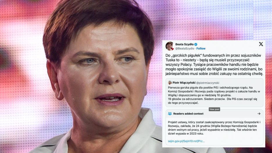 "Tysiące pracowników handlu nie będzie mogło spokojnie zasiąść do Wigilii ze swoimi rodzinami, bo jaśniepaństwo musi sobie zrobić zakupy na ostatnią chwilę" - grzmi na platformie "X" (kiedyś Twitter) Beata Szydło, nawiązując do głosowania ws. noweli ustawy o ograniczeniu handlu w niedziele i święta. Wpis europosłanki PiS został opatrzony informacją kontekstową, zamieszczaną w celu weryfikacji publikowanych treści.