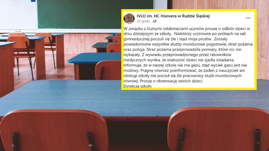 Straż pożarna przeprowadziła pomiary, które nic nie wykazały. Z wywiadu przeprowadzonego przez ratowników medycznych wynika, że większość dzieci nie zjadła śniadania. Informuje, że w naszej szkole nie ma gazu, stąd wyciek gazu jest nie możliwy. Pragnę również poinformować, że żaden z nauczycieli ani obsługi szkoły nie poczuł się źle pracownicy służb mundurowych również - przekazała dyrekcja IV LO im. H.C Hoovera w Rudzie Śląskiej.
