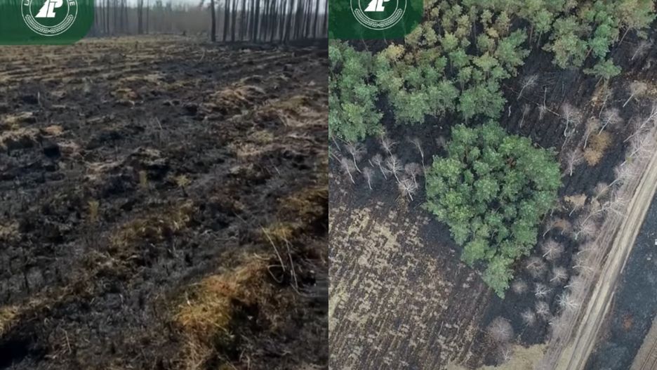 Materiały udostępnione przez Regionalną Dyrekcję Lasów Państwowych w Pile ukazują spalony fragment lasu już po kilku godzinach działania żywiołu.