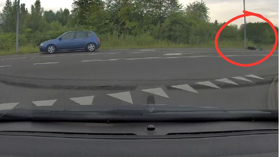 Na nagraniu widać, jak niebieski samochód osobowy odjeżdża, a ok. kilkanaście metrów dalej na ulicy leży rowerzysta.