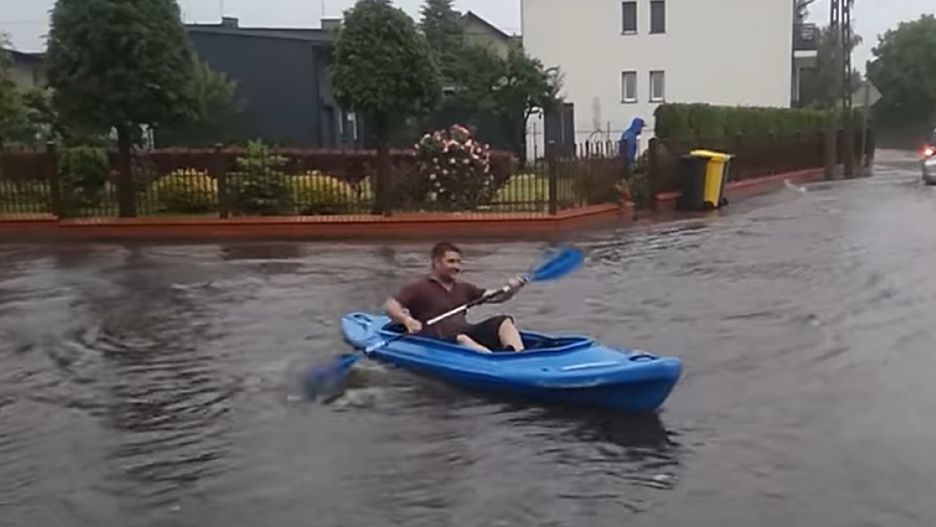 Mężczyzna w stojącej na ulicach wodzie dostrzegł niepowtarzalną okazję, by... popływać kajakiem w środku miasta. Na Facebooku opublikowano nagranie, na którym wielunianin radośnie kajakuje sobie wzdłuż ul. Prusa.