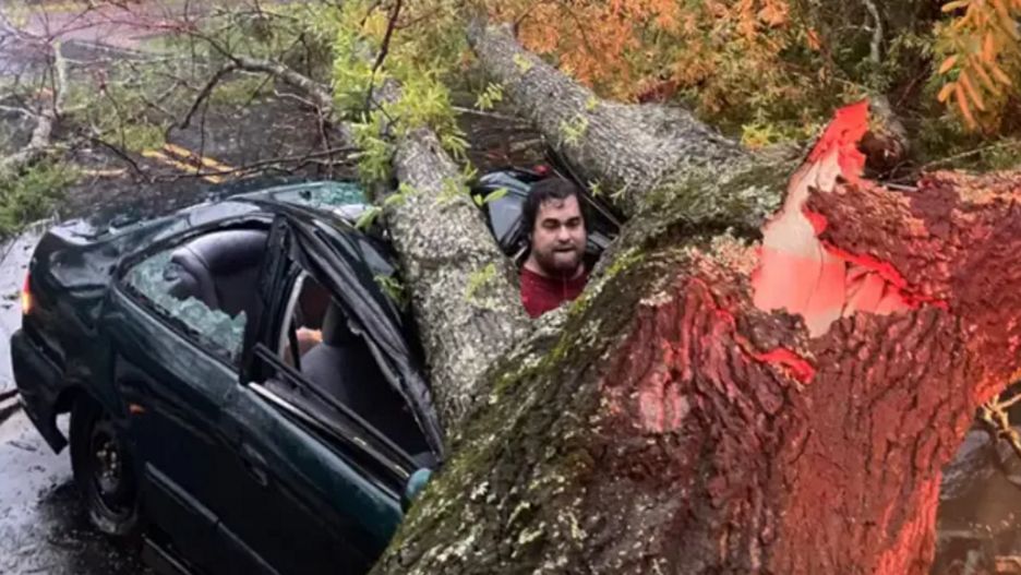 Siła żywiołu była na tyle duża, że powaliła przydrożne drzewo. Jego gigantyczna gałąź zmiażdżyła nagle samochód 37-latka. Jakimś cudem konar ominął kierowcę, który obserwował burzę w niestandardowej pozycji. Zapewne gdyby kilka chwil wcześniej ni wyjrzał zza szyberdach to zginąłby w przerażających okolicznościach.