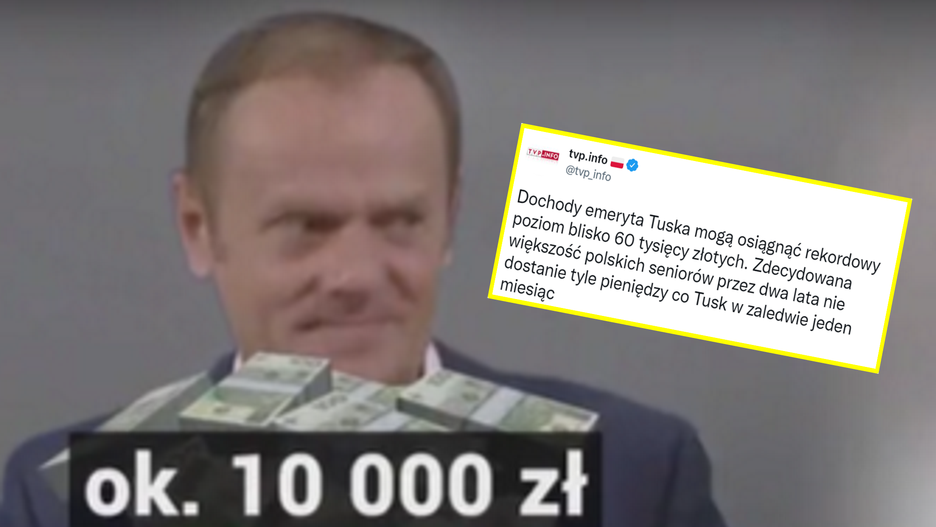Materiał z "Wiadomości" TVP Info opublikowała na Twitterze. W opisie zwrócono uwagę, że Tusk otrzymuje miesięcznie więcej pieniędzy niż przecięty polski emeryt przez dwa lata.