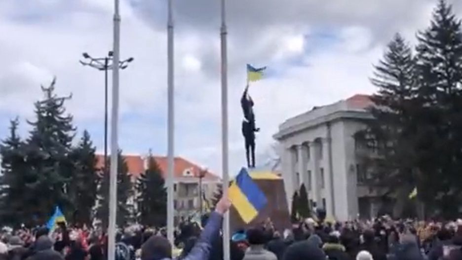 W mediach społecznościowych pojawiło się nagranie z placu w centrum miasta. Widać na nim, jak dwie protestujące osoby wspięły się na maszt, by zawiesić ukraińską flagę. Pozostali demonstranci bili im brawa, wiwatowali i krzyczeli "Ukraina".