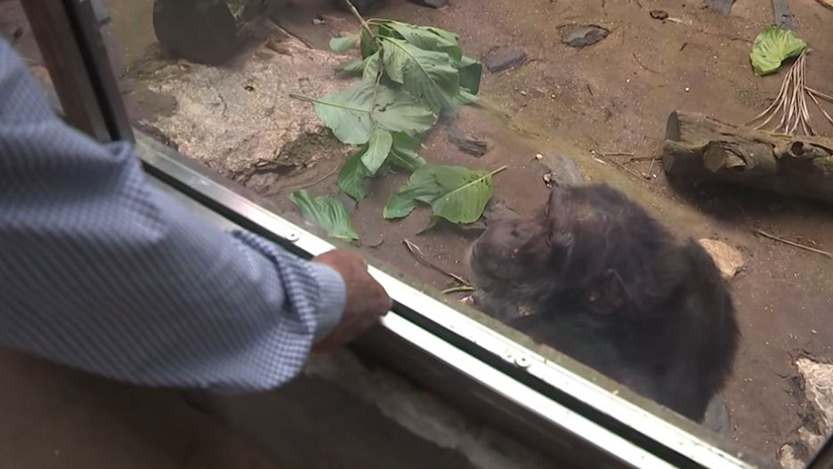 Reakcja szympansa poruszyła pracowników zoo. Zwierzę zaczęło uderzać w przezroczyste ogrodzenie, a następnie całować rękę Toma Wyatta przez szybę.