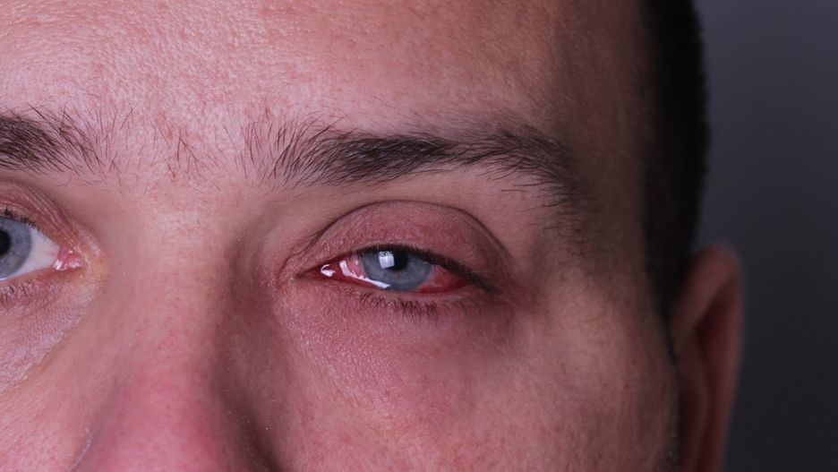 Objaw ten naukowcy nazwali potocznie "pink eye". Polega on na tym, że oko robi się zaczerwienione, przez co z daleka wygląda, jakby miało różowy kolor. Towarzyszy temu również ból. Powieki stają się ociężałe, a mruganie okazuje się sporym wysiłkiem.