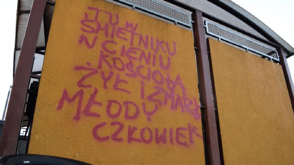 Na wiacie śmietnika pojawił się napis, który wzbudza ogromne kontrowersje. Jego autor sugeruje, że śmierć młodego człowieka mogła być w jakikolwiek sposób powiązana ze znajdującym się w pobliżu kościołem pw. Matki Bożej Królowej Polski.