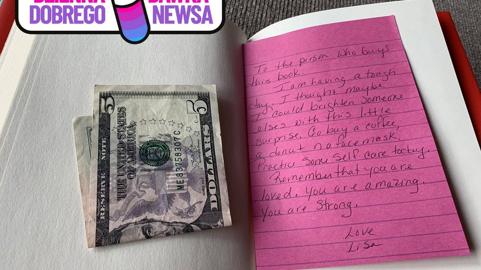 Dla osoby, która kupi tę książkę: mam naprawdę ciężki dzień. Pomyślałam więc, że mogę sprawić radość komuś innemu za pomocą małej niespodzianki. Kup sobie kawę, pączka albo i śmieszną maskę na twarz. Zadbaj dzisiaj o siebie i pamiętaj, że są ludzie, którzy cię kochają. Jesteś niesamowity i masz siłę. Pozdrawiam, Lisa – tak brzmi zamieszczona na kartce wiadomość.