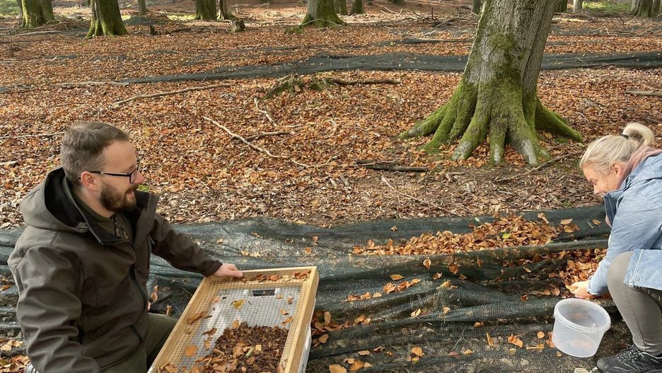 Zbiory nasion przypominają nieco poszukiwania bursztynu. Leśnicy mają przy sobie sprzęt do przesiewania zbędnych rzeczy, jakie nabiorą ze ściółki.
