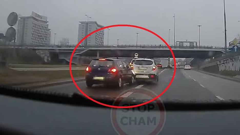 Kierowcy obu aut jadą obok siebie dobre kilkaset metrów. Agresja pomiędzy nimi zaczyna się mniej więcej na wysokości stadionu piłkarskiego Legii. Z nagrania wynika, że kierowca volkswagena golfa próbował zmienić pas na lewy, jednak zrobił to zbyt szybko, przez co wymusił pierwszeństwo. Kierowca opla musiał nagle hamować.