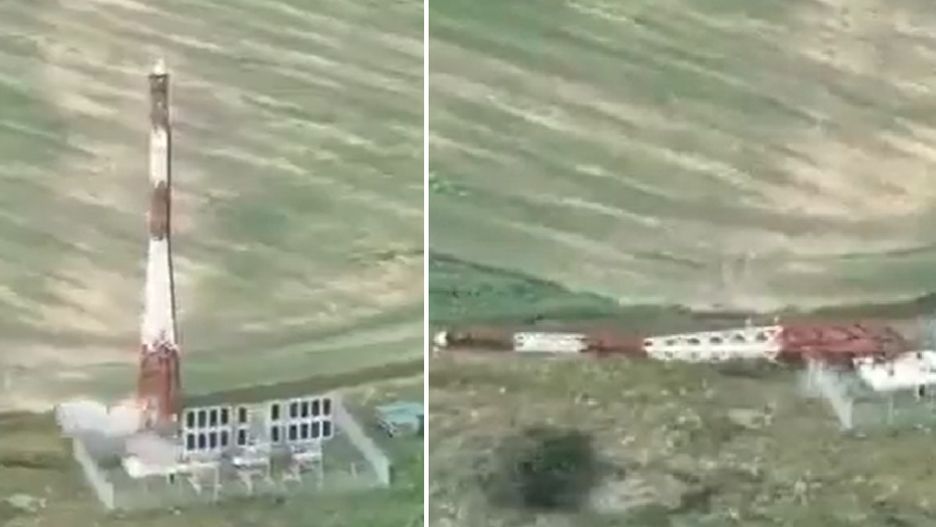 Wieża dozoru radiowego, trafiona prawdopodobnie przy pomocy drona kamikadze, przewróciła się po dosłownie kilku sekundach od oddania celnego strzału. Do zdarzenia doszło po rosyjskiej stronie granicy.