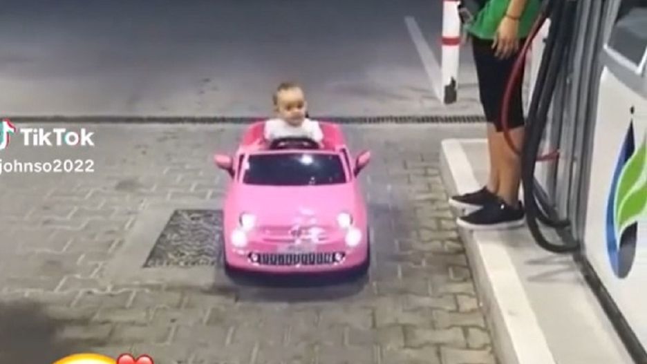 Na nagraniu widać jak mała dziewczynka wjeżdża swoim różowym, zabawkowym kabrioletem na prawdziwą stację benzynową. Od razu kieruje się pod dystrybutor z paliwem. Tam parkuje i podaje pracownicy coś na kształt banknotu. Widać, że jest bardzo skupiona na tym, co robi.
