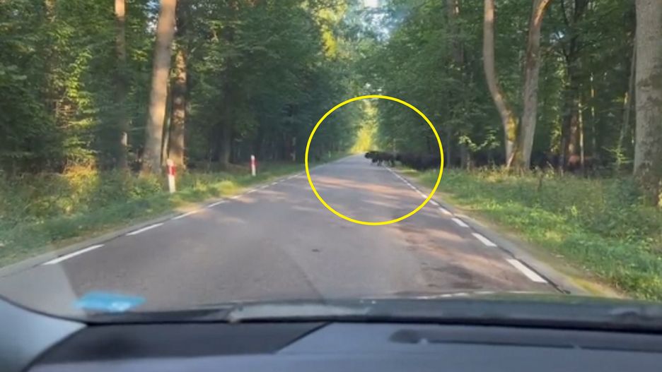 W pewnym momencie drogę przejazdową zaczęło przemierzać kilkanaście żubrów, w tym kilkoro małych. Ale widok! Leśniczy nie mógł się powstrzymać i zaczął nagrywać.