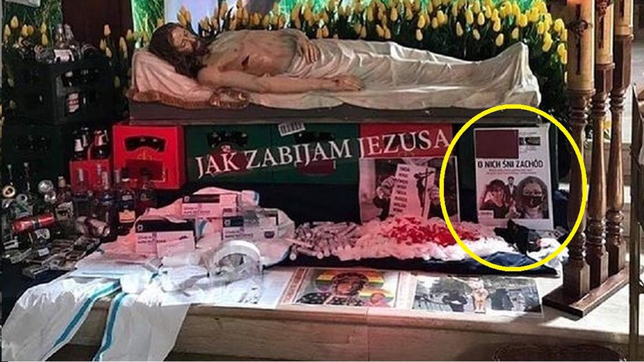W Kościele św. Apostołów Piotra i Pawła w Łapach (woj. podlaskie) powstał kontrowersyjny Grób Pański. Obok napisu "Jak zabijam Jezusa" pojawiły się butelki po alkoholu, kombinezon ochronny, Matka Boska na tle tęczy oraz wizerunek Marty Lempart, Margot i Barta Staszewskiego.