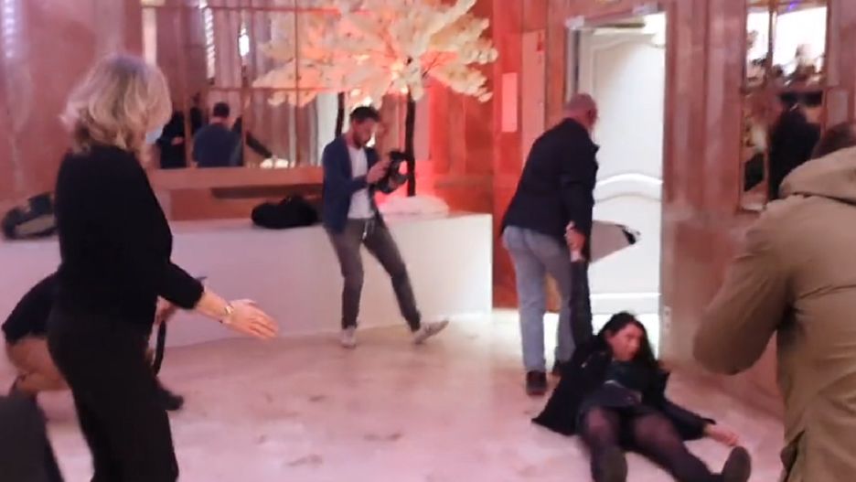 Ochrona szybko złapała kobietę i brutalnie wyciągnęła z sali. Wszystko zostało nagrane i zamieszczone w mediach społecznościowych. Le Pen jak gdyby nic kontynuowała odpowiadanie na pytania.