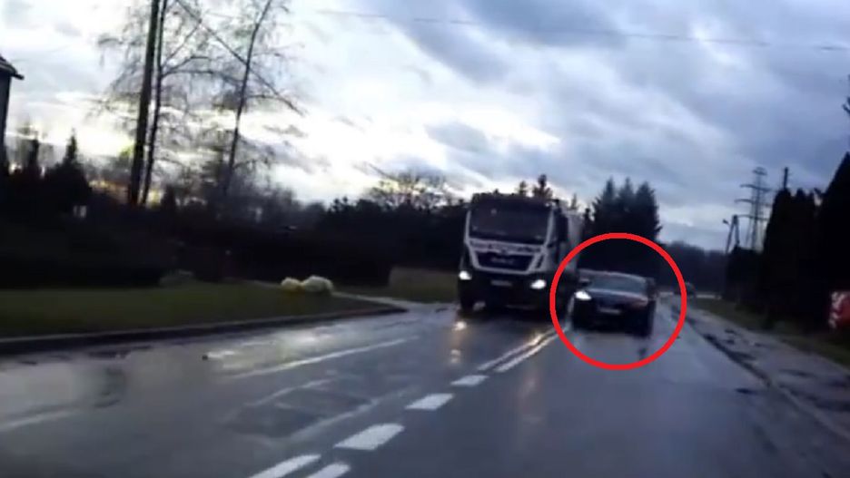 Kierujący osobowym audi, nie zważając na linię podwójną ciągłą, rozpoczął manewr wyprzedzania ciężarówki. O mało nie doprowadził jednak do czołowego zderzenia z jadącym z naprzeciwka innym pojazdem. Tragedii zapobiegła tylko szybka reakcja prawidłowo jadącego kierowcy. Przy akompaniamencie klaksonu błyskawicznie zatrzymał on pojazd, co pozwoliło dokończyć manewr audi, wyprzedzającego w niedozwolonym miejscu.