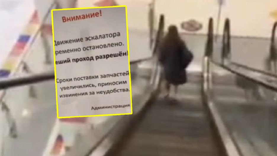 Ruch schodów ruchomych został tymczasowo zatrzymany. Chodzenie dozwolone! Czas oczekiwania na dostawę części zamiennych wydłużył się, przepraszamy za niedogodności - czytamy na karteczce w centrum handlowym w Rosji.