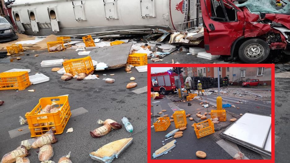 Z jednego z uczestniczących w zdarzeniu samochodów wysypał się chleb. Bochenki leżące na ulicy to smutny widok... Strażacy z czterech zastępów mieli ręce pełne pracy.
