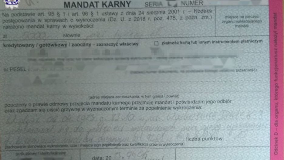 Za popełnione wykroczenie agresywny kierowca został ukarany mandatem karnym w wysokości 5 tysięcy złotych i 15 punktów karnych.