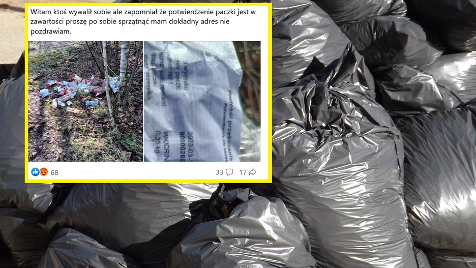 Witam. Ktoś wywalił sobie, ale zapomniał, że potwierdzenie paczki jest w zawartości. Proszę po sobie sprzątnąć, mam dokładny adres. Nie pozdrawiam — napisał jeden z mieszkańców Józefowa.