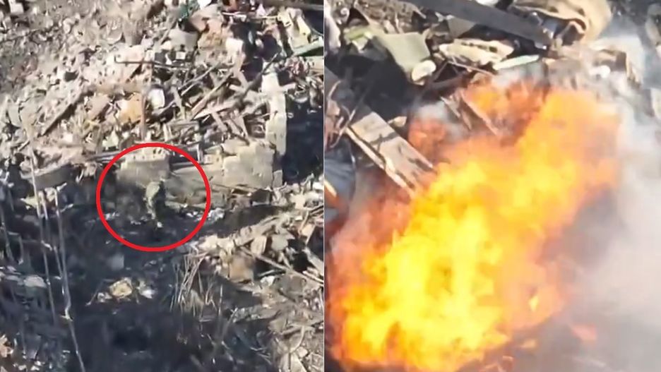 W pewnym momencie dron podlatuje bliżej i wybucha. Po chwili pojawiają się płomienie. Dochodzi do pożaru. Z płonącej stery gruzów nagle wybiega płonący Rosjanin. Prowadzi dramatyczną walkę o to, aby ugasić ogień, ale żadne działania nie przynoszą rezultatu. Następnie wskakuje za obiekt, który kształtem przypomina studnię. Mężczyzna wszedł do środka. Nie wiadomo, czy przeżył, ale obrażenia byłby prawdopodobnie bardzo ciężkie i mogły skutkować śmiercią.