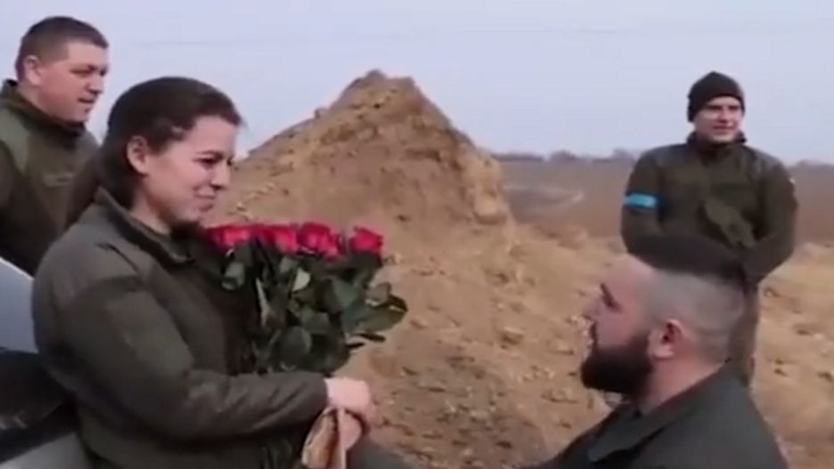 Wołodymyr, żołnierz Gwardii Narodowej Ukrainy, zaskoczył swoją wybrankę pierścionkiem i bukietem czerwonych róż. "Irinko moja kochana(...) wyjdziesz za mnie?" - zapytał.