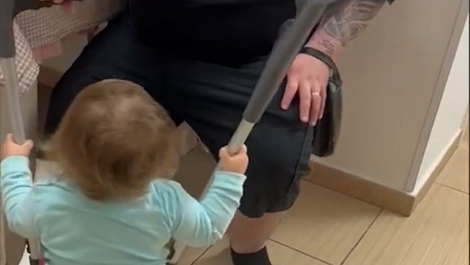 Tata dziewczynki ma złamaną nogę i chodzi o kulach. Mała Antonina, by ułatwić mu przejście, odsunęła krzesło i chwyciła go za nogi. Lekko popchnęła mężczyznę na krzesło, jakby naprowadzając go na siedzisko. Następnie, gdy udało mu się już usiąść, zabrała kule, by mu nie przeszkadzały. Taka córeczka to prawdziwy skarb!