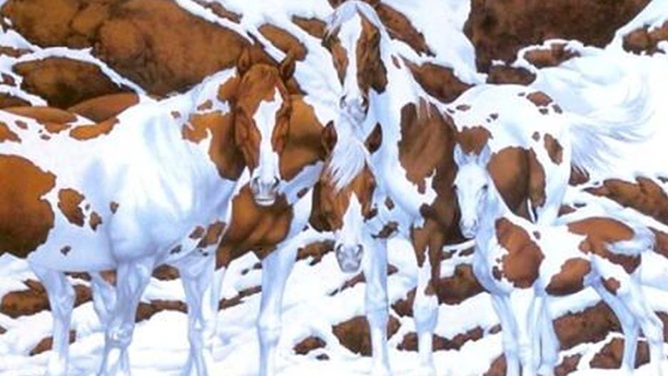 Podobne kolory, linie nachodzące na siebie i tło zlewające się z pierwszym planem sprawiają, że nie wystarczy zaledwie rzut okiem, by policzyć wszystkie zwierzęta. Konie są doskonale zakamuflowane.