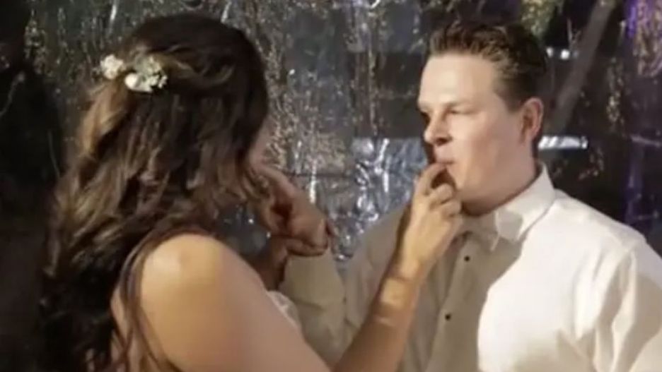 Chwila początkowo wydawała się bardzo romantyczna, zakochani z uśmiechem na ustach zlizywali sobie słodki krem z palców, gdy nagle ziścił się koszmar każdej panny młodej. Świeżo opieczony mąż chwycił w rękę kawałek ciasta i obrzucił nim twarz małżonki, po czym uciekł, prawdopodobnie w obawie przed reakcją partnerki.