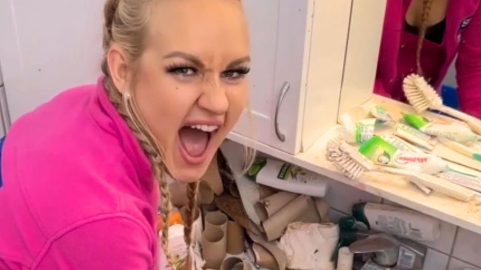 Instagramerka białą miską wylewała z niego brązową wodę. Pokazała też obrzydliwą zawartość - w środku była gruba warstwa starego brudu. Auri usuwa ją jednak w mgnieniu oka. Następnie zajmuje się śmieciami na podłodze i na blatach. Wszędzie stały rolki papieru toaletowego i puste butelki po kosmetykach. W oczy rzuca się też spleśniała mata łazienkowa.
