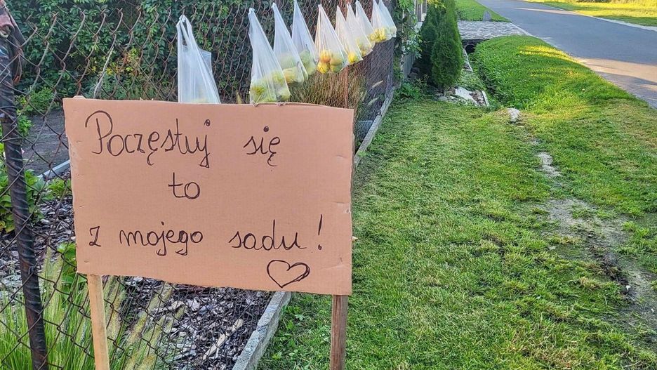 Jak informuje Radio Łódź, sołtys wsi Żagliny Małgorzata Szymańska wraz z rodziną wpadła na pomysł, by częstować chętnych owocami ze swojego sadu. Na ogrodzeniu wywiesili kilka reklamówek z gruszkami. Obok umieszczono tabliczkę z informacją, że owoce są za darmo i można się nimi częstować.