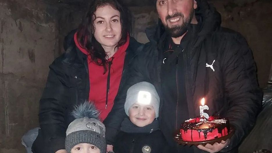 Ukraińska rodzina mimo piekła, jakie ma miejsce w ich mieście, uśmiecha się do zdjęcia. Mąż kobiety trzyma w ręce tort z zapaloną świeczką.