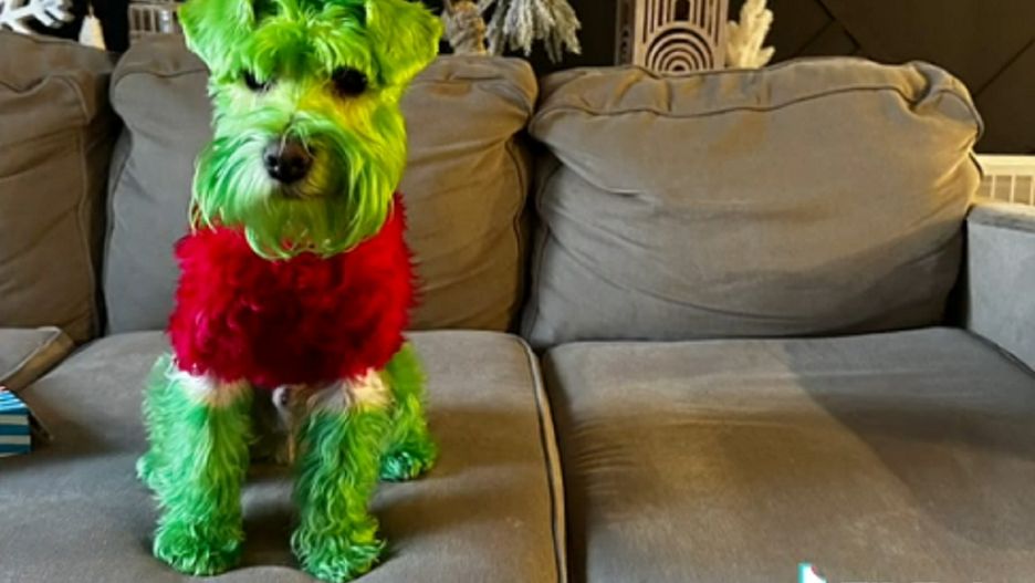 37-latka opublikowała na TikToku filmik, na którym jej sznaucer miniaturowy Rizzo zmienia się w...Grincha. Nie zostaje jednak ubrany w strój słynnej postaci. Jego futro zostało dosłownie przefarbowane w kolory jasnozielony, biały i czerwony.