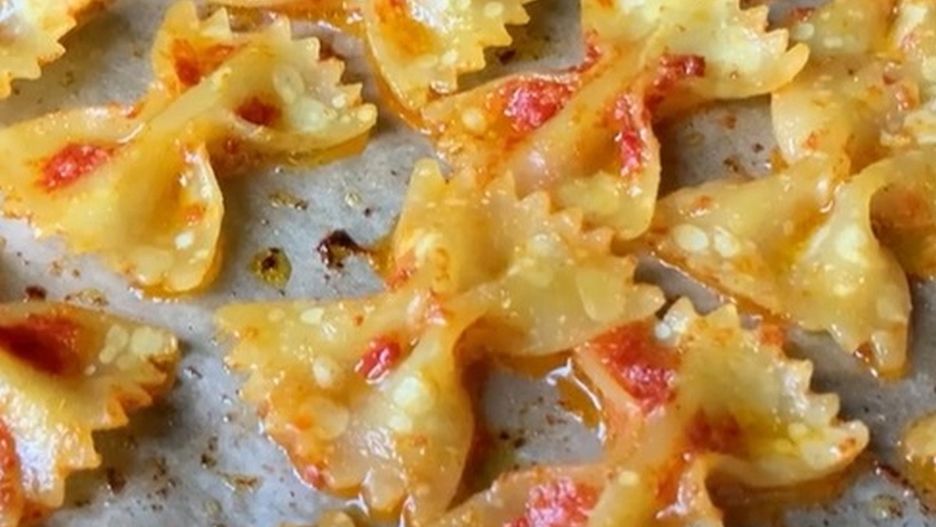 - rozłóż dokładnie makaron na blaszce wyłożonej papierem do pieczenia i posmarowanej odrobiną oliwy