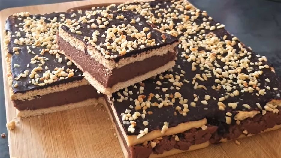 Ciasto pokrój w prostokąty zgodnie z krańcami herbatników. Wierzch możesz dodatkowo polać polewą czekoladową i posypać wiórkami kokosowymi. Smacznego!