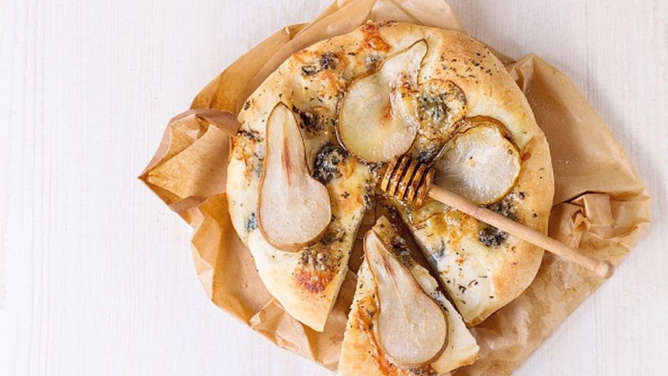 - Gruszkę pokrój w plasterki i ułóż na focacci. Skrop oliwą i piecz 25-30 min w 220 °C.
