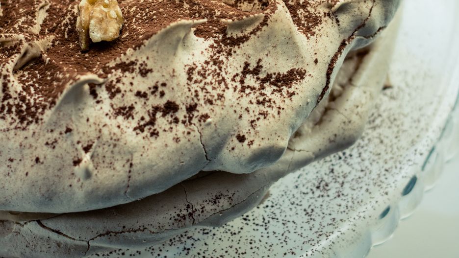 Na wystudzony biszkopt wyłóż przygotowany krem, a następnie przykryj orzechową bezą. Wstaw ciasto do lodówki na całą noc, aby smaki się połączyły. Przed podaniem pokrój na kawałki i udekoruj listkiem mięty.