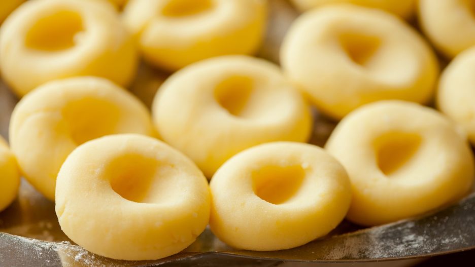Podziel masę na cztery części, jedną odstaw, a w jej miejsce wsyp mąkę ziemniaczaną. Dodaj jajko i sól, wszystko zagnieć na jednolite ciasto. Formuj z niego małe kulki, w każdej zrób wgłębienie palcem.