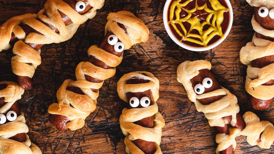 Przygotowanie tych smakołyków zajmuje bardzo mało czasu i wymaga zaledwie kilku składników: parówek, ciasta francuskiego, keczupu i oczu z masy cukrowej. Możesz przekroić parówki na pół lub zostawić je w całości, a potem zawiń je w paski ciasta francuskiego, zostawiając miejsce na oczy. Gotowe mumie piecz przez około 20 minut, a na koniec przyozdób je oczami i keczupem.