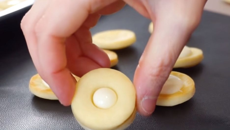 - Nakładaj na środek wklęsłej strony ciastka kleks z mleka skondensowanego i dociśnij wydrążonym ciastkiem