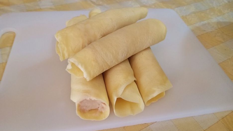 - Gdy zużyjesz już całe ciasto, zacznij nadziewać jeszcze gorące naleśniki. Posmaruj jedną stronę sosem pomidorowym lub keczupem, dodaj tarty ser i farsz – w tej kolejności. Następnie zwiń każdy z gotowych już placków w rulon.