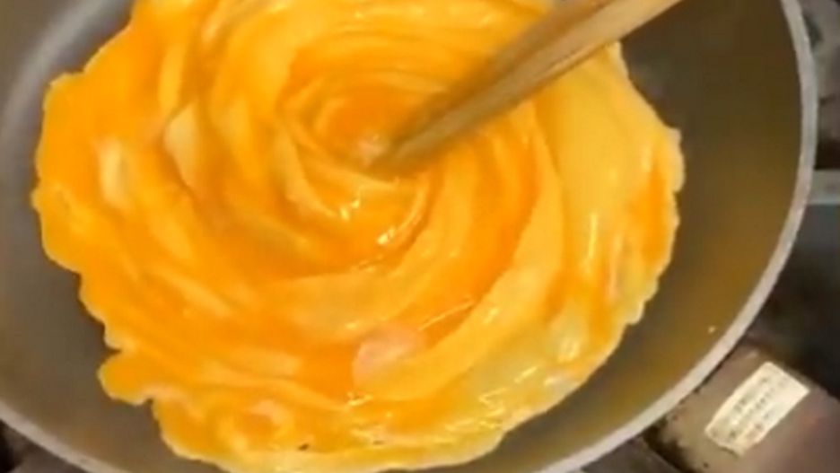 Przepis jest banalnie prosty. Wystarczy wylać rozbite wcześniej jajka na rozgrzaną patelnię. Kiedy jaja zaczynają się ścinać, ale nadal są mokre na wierzchu, trzeba dwie drewniane pałeczki delikatnie przeciągnąć od brzegów omletu do jego środka.