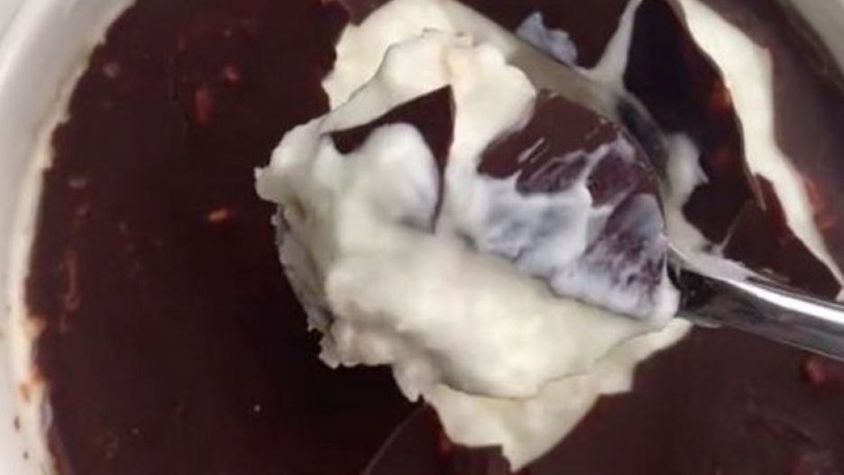 - W oddzielnym naczyniu rozpuść czekoladę i olej kokosowy, wylej je na wierzch płatków z mlekiem i jogurtem.