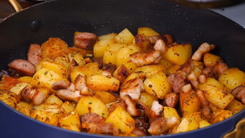 - Kiedy ziemniaki będą miękkie, dopraw potrawę słodką papryką, ziołami prowansalskimi i chilli oraz dodaj podsmażony wcześniej boczek