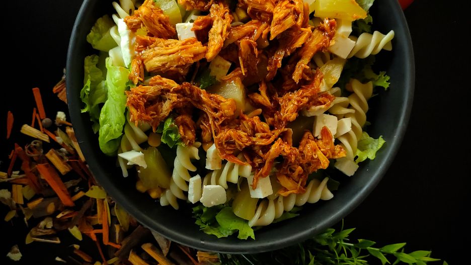 Sałatka z makaronem, szynką i orzeszkami ziemnymi. Szybki i tani obiad