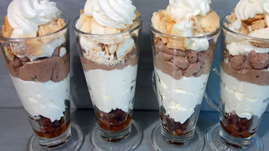 - Połowę bitej śmietany nałożyć do pucharków.